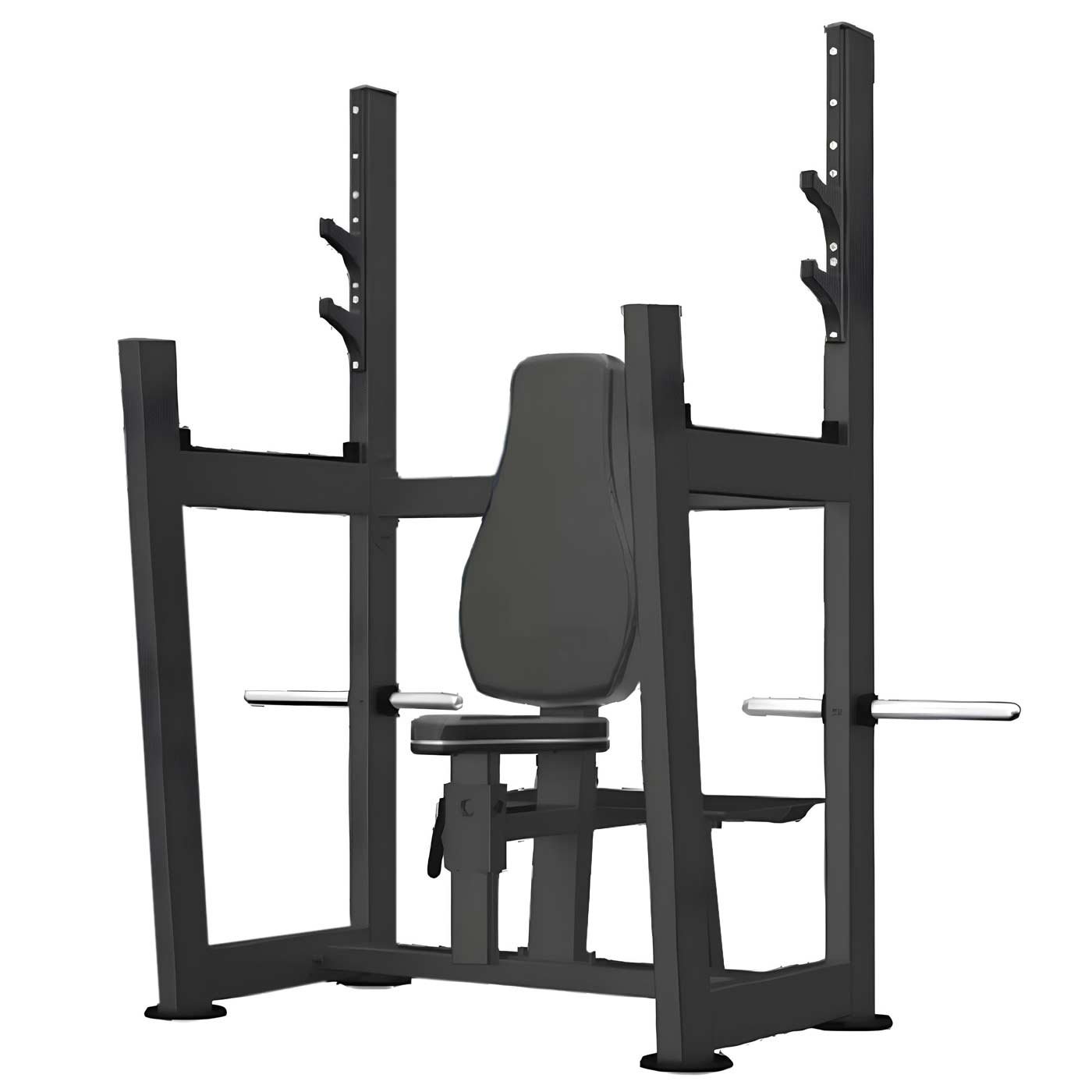 Los usuarios tienen fácil acceso a la barra olímpica, y el cojín del asiento ajustable y el respaldo reclinable brindan un rango de movimiento sin obstáculos con una rotación externa mínima de la articulación del hombro.