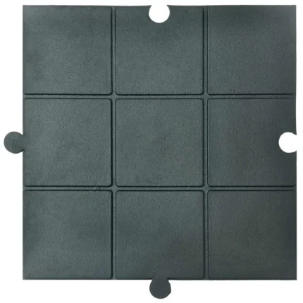 Este revestimiento presenta un tono negro clásico y atemporal que se integra sin esfuerzo en diferentes tipos de espacios, desde gimnasios hasta zonas comerciales y áreas de juego. Su diseño de enclavamiento garantiza una instalación sencilla y segura, creando una superficie uniforme y estable para actividades diversas.