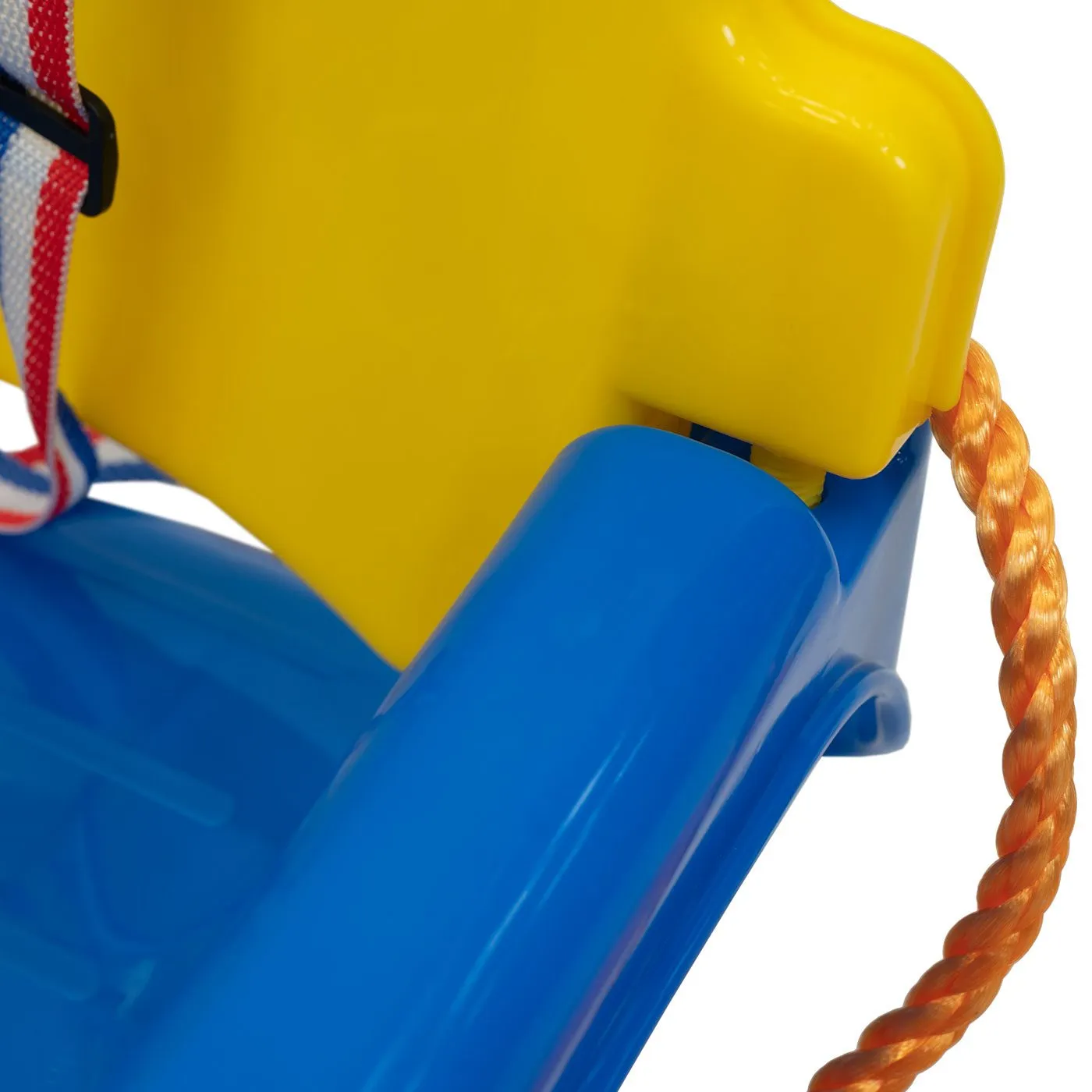 Columpio armable y desarmable en plástico. Con este columpio tu niño estara seguro, puede reclinarse y apoyarse en la base frontal, evitando caidas.