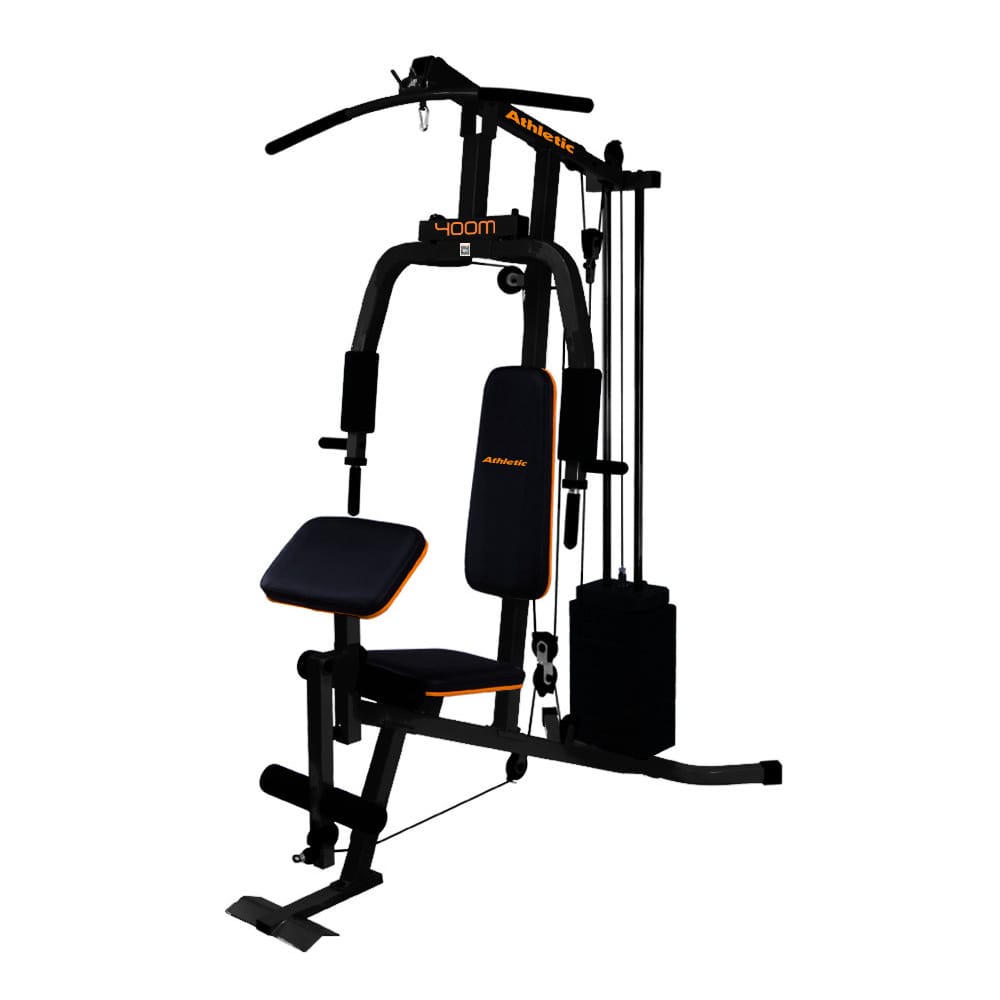 400M (04073) MULTIGIMNASIO ATHLETIC, 1 ESTACIÓN, 1 TORRE DE PESAS 100 LBS (CON PREDICADOR Y ACCESORIOS) El Multigimnasio 400M es una máquina compacta ideal para el hogar, diseñada para ofrecer entrenamientos completos de fuerza tanto para la parte superior como para los miembros inferiores, con un diseño ergonómico que garantiza movimientos biomecánicamente correctos. Su torre de pesas de hasta 45 kg y sus diversos accesorios, como barra de tracción lateral, barra corta, correa para tobillo y cadena con mosquetones, permiten trabajar 19 grupos musculares. Incluye polea intermedia, tirón dorsal y barras de remo bajas, soportando un peso máximo de usuario de 120 kg y una altura de hasta 2 metros. Sus dimensiones son 158,5 x 102 x 200 cm, perfectas para uso residencial.