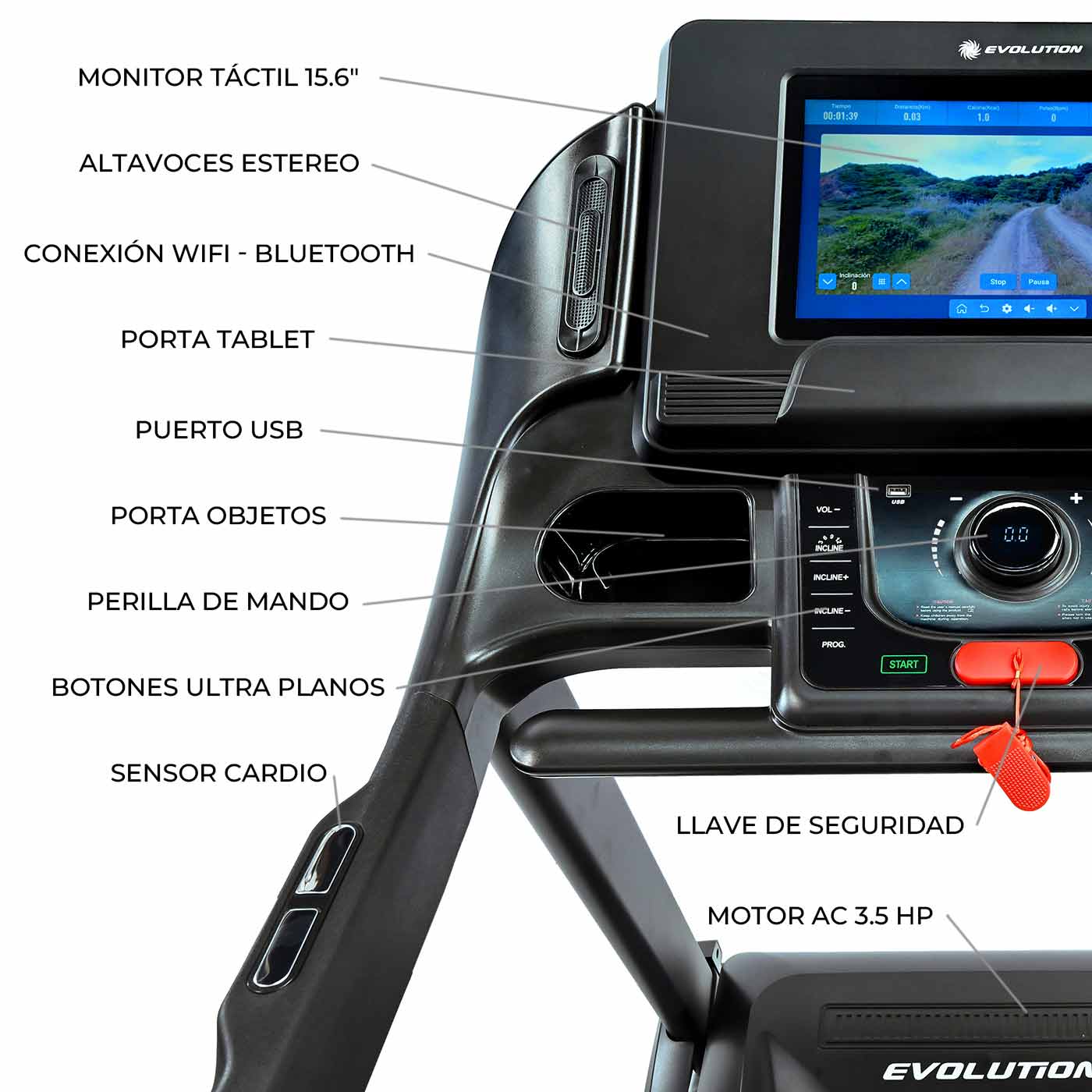 Con su potente motor AC de 3.5 HP y velocidad máxima de 20 km/h, ofrece lecturas detalladas en su consola TFT de 15.6″. Monitorea tiempo, velocidad, distancia, calorías y pulso.